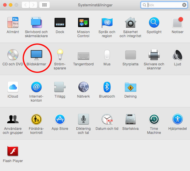 1. Klicka på Menyn längst uppe till vänster och välj Systeminställningar. Välj därefter Bildskärmar.