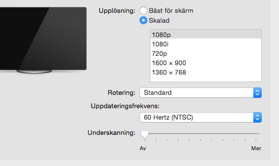 Skulle det vara så att bilden ser konstig ut eller att ingen bild visas klickar du på Bildskärm och testar en annan upplösning i listan över upplösningar. Har du en platt-TV mår de flesta sådana bäst av antingen 1920×1080 pixlar alternativt 1280×720– eller 1366×768 pixlar. Har du istället en tjock-TV bör du inte överstiga 720×576 pixlar.