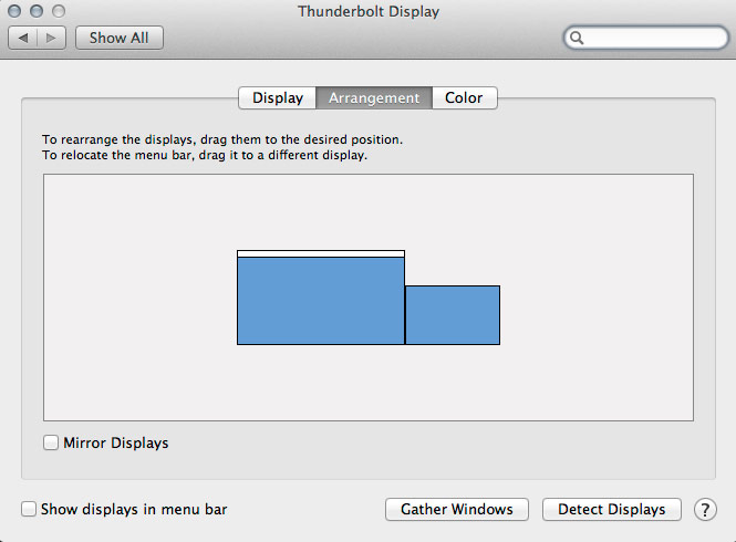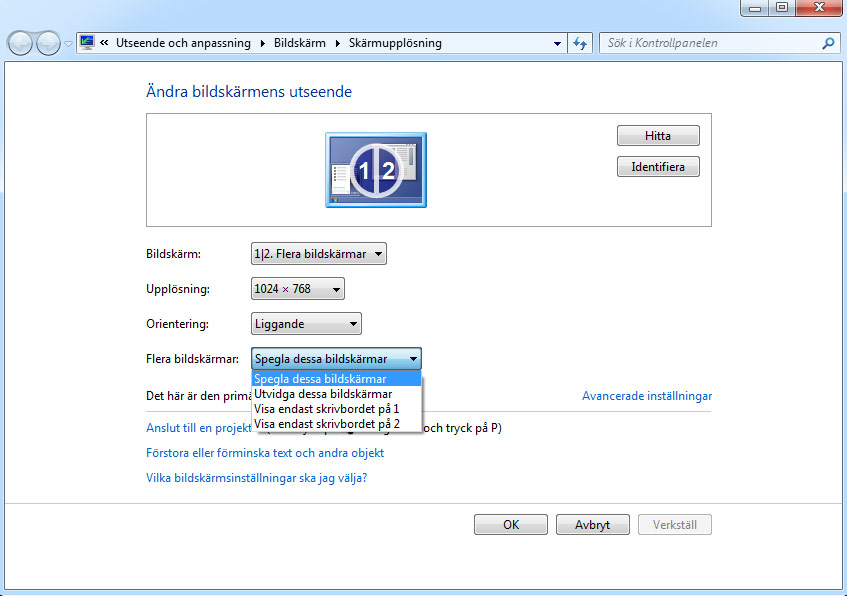 4. Vill du hellre utöka datorns skrivbord så att du till exempel kan visa en film på TV:n medan du gör något annat på datorn klickar du ur Skärmbildsdubblering varpå du istället bör se de båda skärmarna bredvid varandra i rutan. I detta läge kan de båda skärmarna ha olika upplösning utan att påverka varandras bildkvalitet.