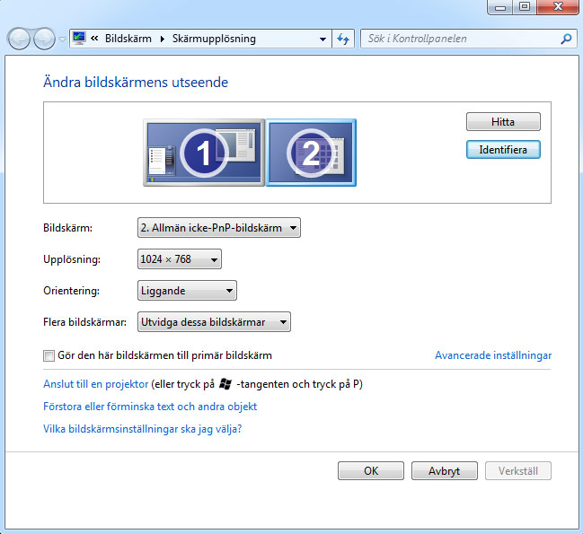 1. Högerklicka på Skrivbordet och välj Skärmupplösning. Ser du endast en skärm klickar du på Hitta. Nu borde du se två stycken skärmar i rutan. Klicka på Identifiera för att kolla vilken av dem som är din datorskärm.