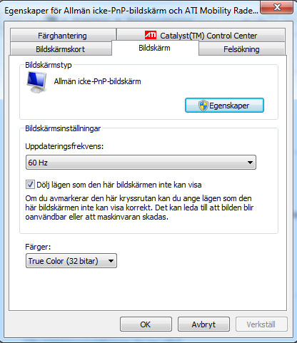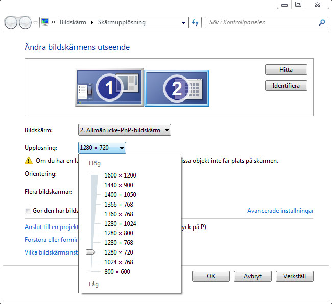4. Skulle bilden på TV:n se konstig ut alternativt inte visas alls är det förmodligen för att den skickas ut i fel upplösning. Markera därför din TV i rutan överst och testa därefter ändra Upplösningen. Har du en platt-TV mår de flesta sådana bäst av antingen 1920×1080 pixlar alternativt 1280×720– eller 1366×768 pixlar. Har du istället en ”tjock-TV” bör du inte överstiga 720×576 pixlar. Dra reglaget till den upplösning du vill testa och klicka på Verkställ. Förhoppningsvis ser du nu bilden på TV:n.