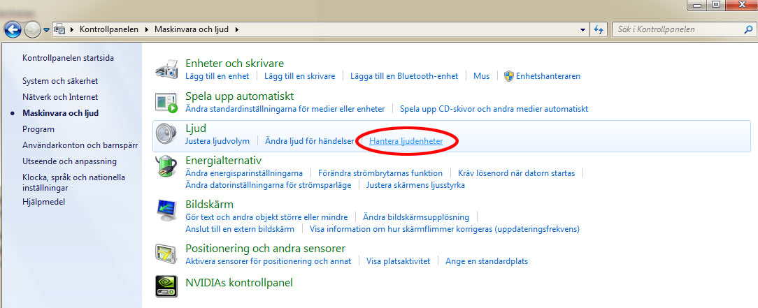 2. Välj därefter Ljud och Hantera Ljudenheter.