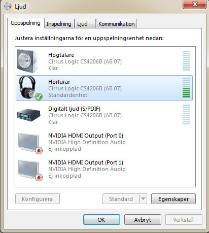 3. Välj fliken Ljud ut och markera din TV i inställningarna. Om du kopplat ljudet via hörlursuttaget hittas förmodligen din TV som just Hörlurar i listan. Klicka på din TV (alternativt Hörlurar) för att berätta för din dator att du vill att ljudet skickas till TV:n istället för några andra högtalare.