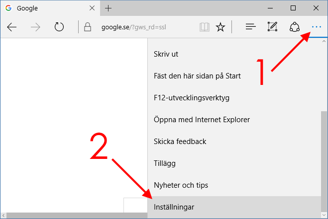 1. Börja med att klicka på de tre prickarna högst upp till höger i programfönstret för att komma åt menyn (1). Välj därefter Inställningar (2).