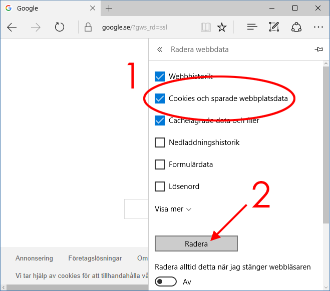 3. Se till att alternativet Cookies och sparade webbplatsdata (1) är ikryssat. Klicka sedan på Radera för att ta bort samtliga cookies som finns sparade i webbläsaren.
