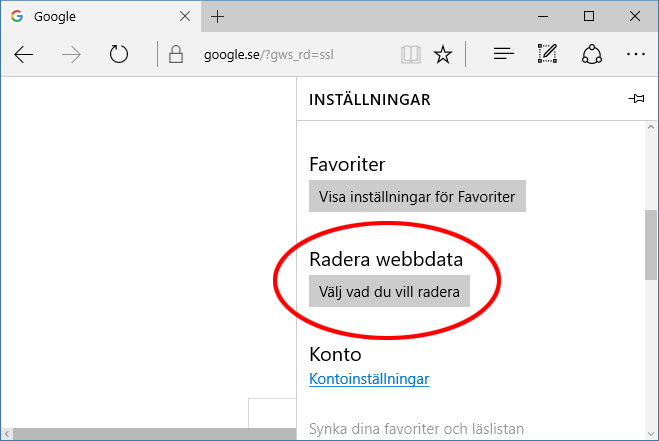 Microsoft Edge är den enda av webbläsarna i denna guide där du inte har någon möjlighet att radera enskilda cookies. Här finns i stället endast möjligheten att ta bort samtliga cookies i ett enda svep.