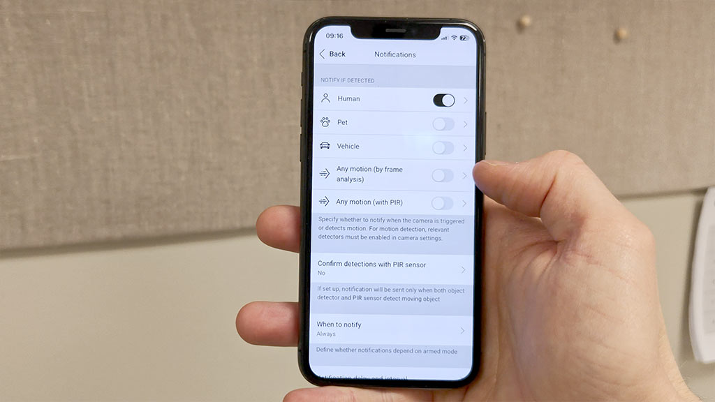 För det första finns inbyggda möjligheter att analysera vad kameran ser. Här går det både att bestämma att t.ex. en inspelning ska starta eller att notiser ska skickas vid rörelse samt huruvida kamerans inbyggda AI-funktioner automatiskt ska analysera vad som faktiskt syns på bilden. T.ex. går det att ställa in att kameran inte reagerar på husdjur, men skickar en notis eller larmar om en människa syns i bild. En funktion som fungerat utmärkt under tiden jag testat kameran.