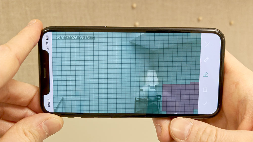 Det går därtill att ställa in dolda zoner i en övervakad vy. Så att kameran t.ex. bortser från rörelse i en viss del av synfältet. Även detta för att undvika onödiga notiser om rörelse eller alarm (om kameran är inställd att utlösa ett sådant).